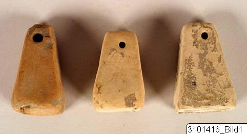 - Loom weight of pyramidal shape with one hole in the uppermost part; carved depression (groove) in bottom of base. Buff clay.