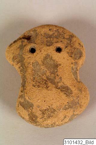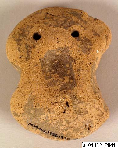 - Originally a loom weight with two drilled holes and (probably ) some form of impression in the centre of one side; the sides have been carved making it the shape of a halter. Yellowish red clay.