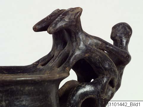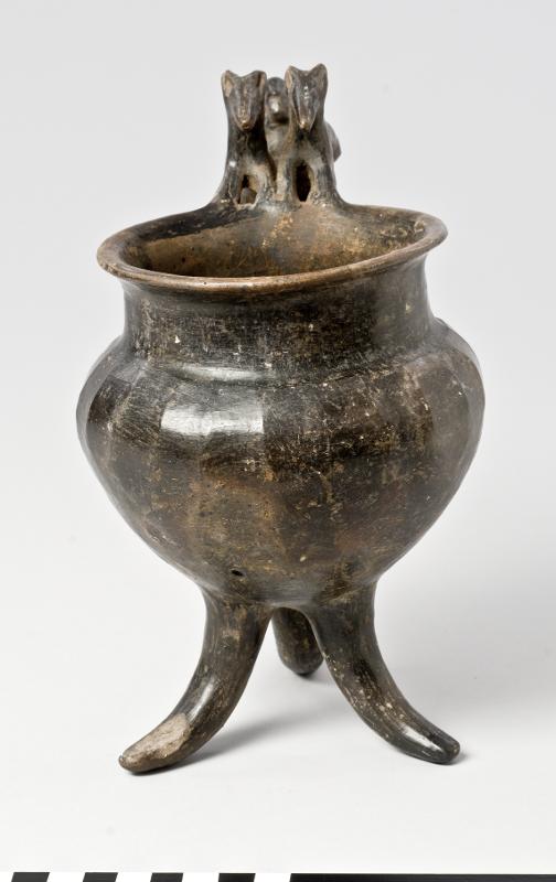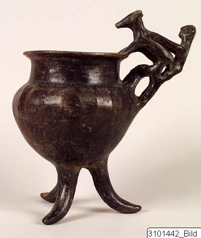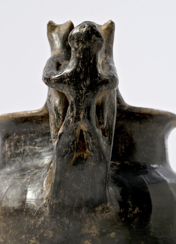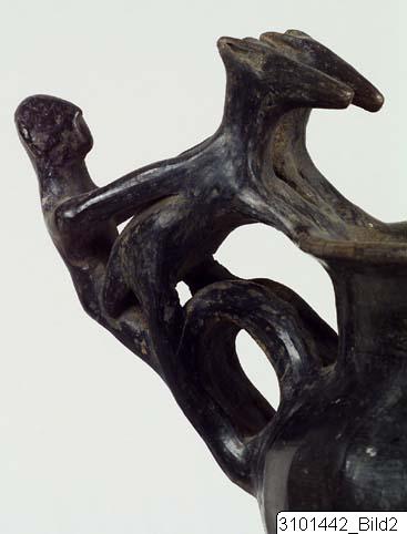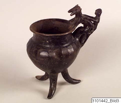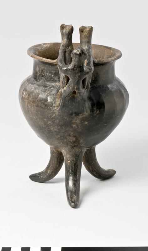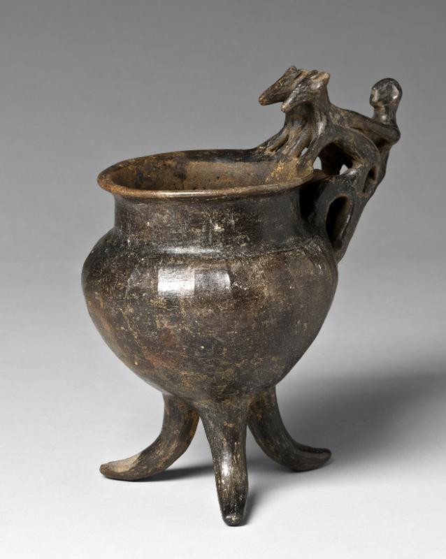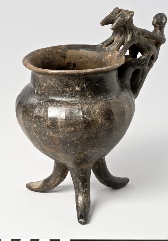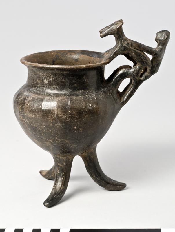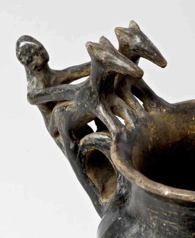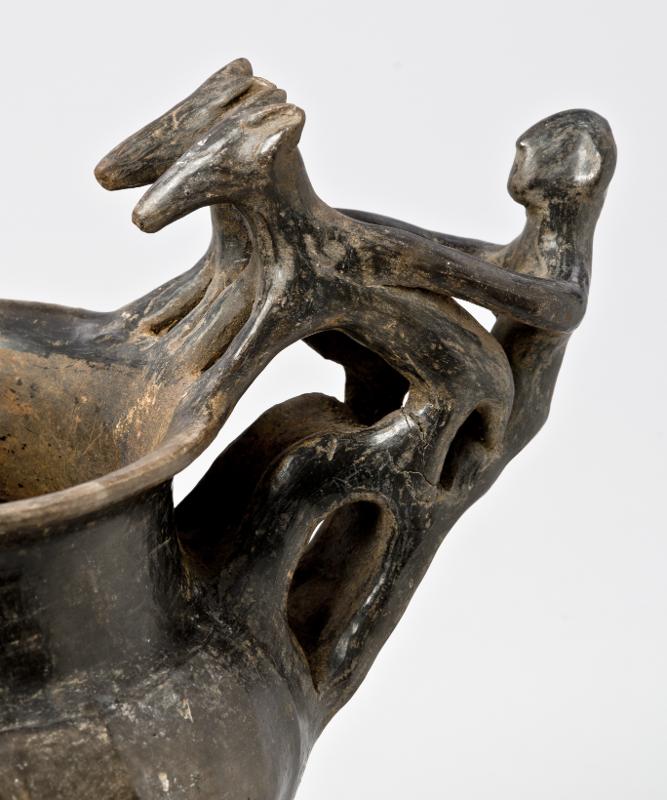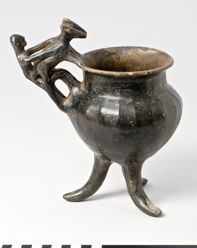 - Flaring rim; plastic decoration attached to rim and handle: a male figure with marked ears and nose behind two animals with long heads, his arms outstreched over the backs of the animals which stand with their hindlegs on the handle and the front legs on the rim; vertical handle from base of neck to shoulder; biconical body; three rounded feet. Brown-black impasto; burnished.