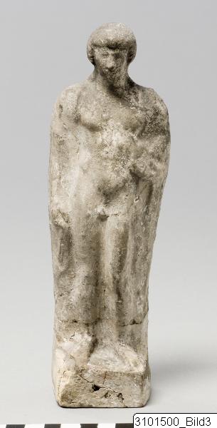- Youth standing on high base; stiff pose with weight on his right leg; dressed in a symmetrical cloak covering his back and shoulders, otherwise naked; he holds a cockerel in the crook of his left arm and his right arm hangs at the side; back not modelled; large rectangular vent in back (10.4 x 5.0). Grey clay with traces of glossy white slip all over the front and red paint on the cloak at his left side.