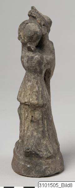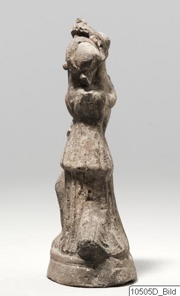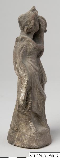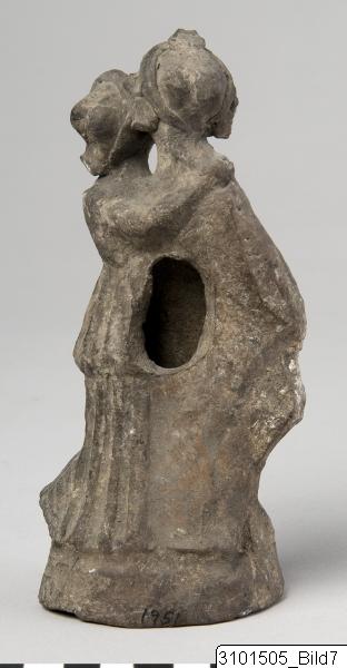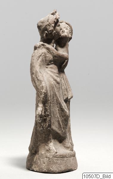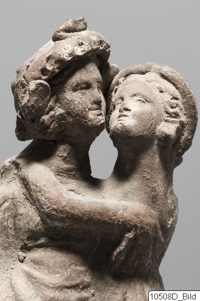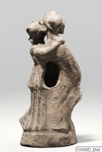 - Loving couple standing on a spool-base; the female figure, wearing a chiton and a wreath, holds her arms around the man’s neck; the male figure, wearing a chlamys, a wreath and boots stands leaning towards the woman with his right arm hanging at his side; both figures have chubby faces; back fullt modelled; oval vent in back (ø 3.4 x 1.8). Reddish-brown clay with traces of white paint.