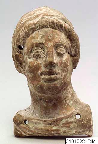 - Bust of man; mould-made; his head turned slightly upwards, to his left; he wears a wreath; the cloak is fastened at his right shoulder; three drilled holes are preserved (a fourth was presumably where the plaster replaces the broken-off piece) - one above his right ear and one in either shoulder; no back part. Dark red clay with traces of a white slip.