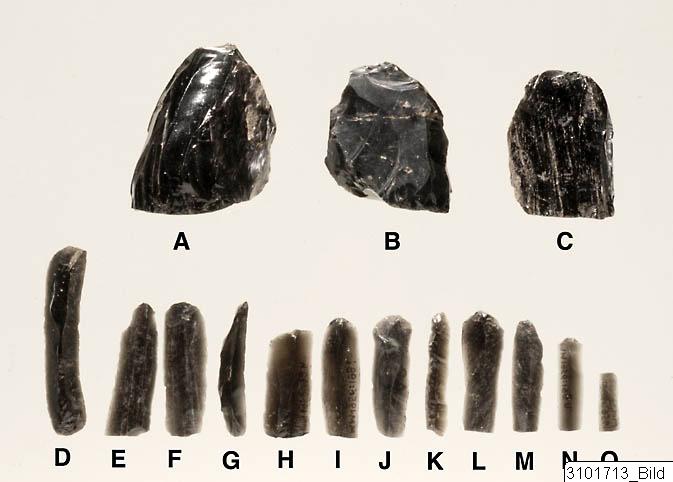 - Piece of obsidian core block; sharp edge on one side; fairly flat base.