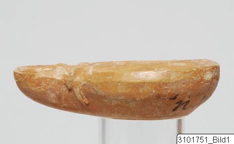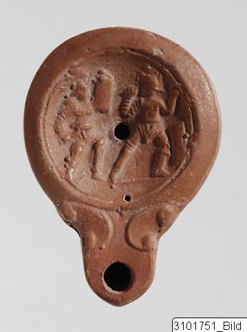 - Mouldmade lamp; circular body with convex profile; slightly concave base, surrounded with a groove. An inscription on base: C.OPPI.RES. The voluted nozzle has a slightly angular tip. No handle. Sloping, wide shoulder. The concave discus with slightly asymmetrically located opening, and an air-hole, has a groove around its edge. On the discus is a gladiatorial combat. Brick-reddish clay and slip.