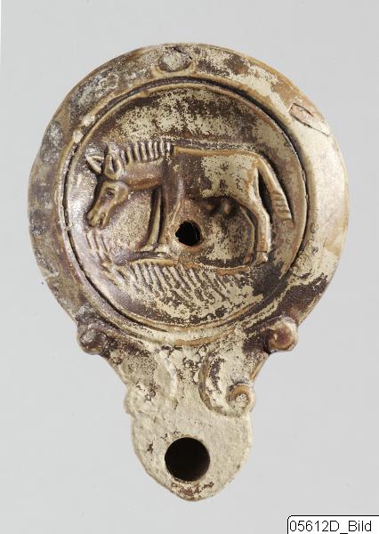This Roman terracotta lamp is decorated with a grazing donkey, an animal described by several ancient authors as being stubborn, servile and stupid. The lamp, dated to the first century CE, was acquired from Consul Ehrenhoff at Tangier, Morocco.