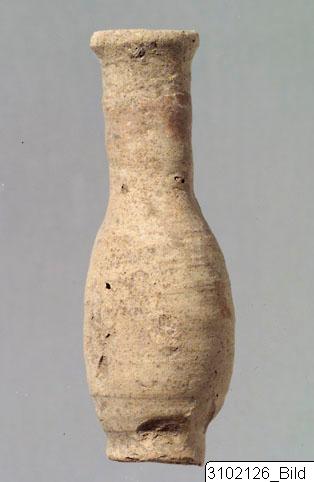 - Slender, ovoid body with very sloping shoulder. Flat, raised base. Tall, narrow neck. Flaring mouth with short, rounded rim. Carelessly applied paint on neck. Blotches of paint on body. Rough surface with irregularities. Semi-fine, very pale brown fabric. Red paint.