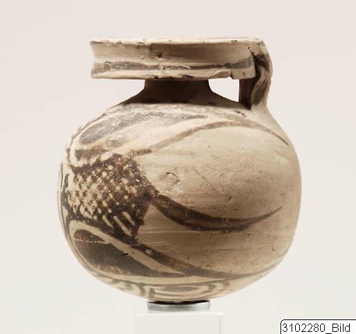 - Globular aryballos with broad disc mouth, short neck and rounded base. Broad ribbon handle from lip to shoulder. Mouth and edge of rim encircled by narrow and broad bands. Body (opposite handle) and base decorated with quatrefoil ornament. Fine, pale pinkish-brown fabric, very pale brown slip. Strong brown to black paint.