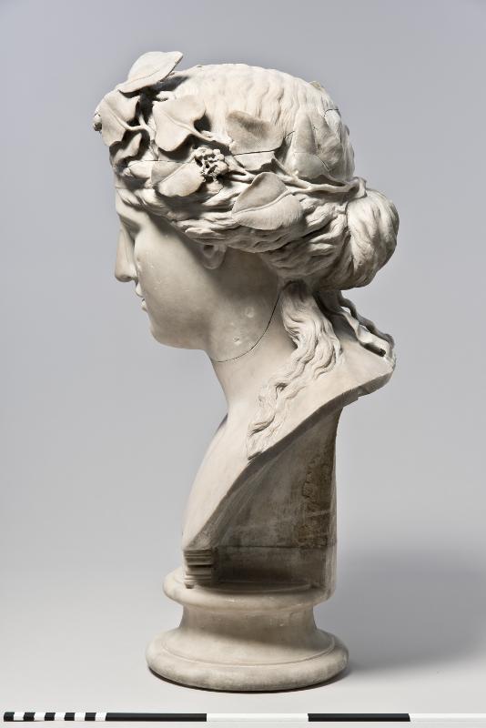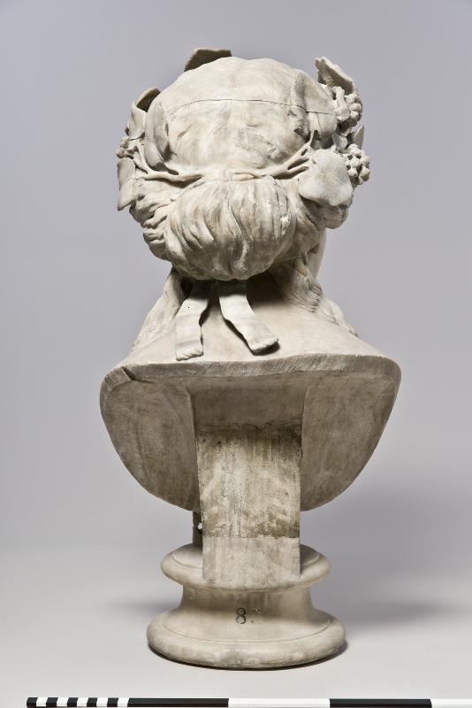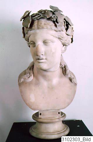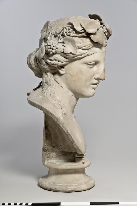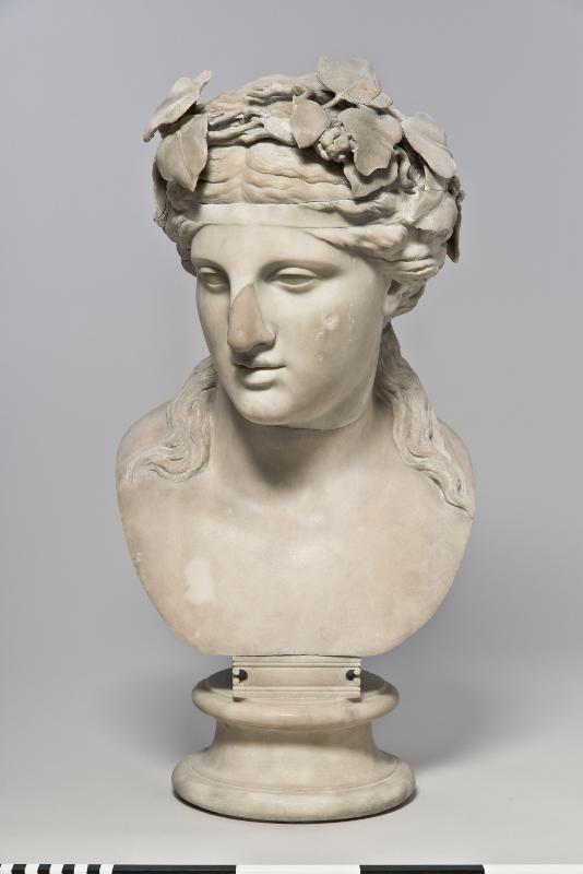 - Bust of Dionysos. Head slightly tilted to the left (figure’s right). Full, oval face with high forehead. Almond-shaped eyes with upper and lower eyelids indicated, framed by thin eyebrows. Straight nose. Rather small mouth with full, slightly parted lips. Face framed by hair, rendered in loose waves, drawn back from the face and tied in a knot at the nape of the neck, leaving some long strands falling down each side of the neck. On the head is a naturalistically rendered ivy wreath with leaves and berries, its ends tied togeteher at the back of the head. White marble with highly polished surface.