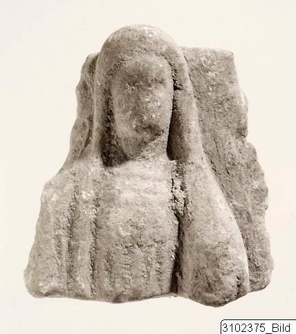 - Relief plaque depicting female figure en face. Narrow face, no features visible. Head covered by veil. Draped in garment with parallel horizontal ridges (indicating folds or necklace?) across chest. Smaller figure? to the left. Unworked back.