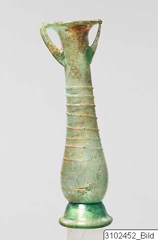- Flaring rim. Angular handles from rim to neck. Slender, almost tubular body. Conical base, edge of base rounded. Spiral thread of glass covering body. Green, opaque glass.