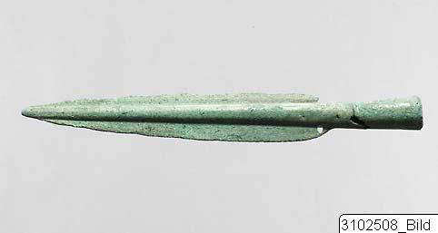 - Long, conical shaft-case that continues into the blade, forming a ridge. The edges are rounded and widened backwards.