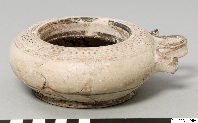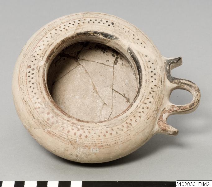- Incurved rim with slightly convex inner wall. Rounded upper body, Lower part conical. Horizontal reflex handle at upper body. Low, flaring base. Buff clay, semilustrous, buff slip. Decoration in matt black and red paint: Black and red bands encircling incurved rim, double row of dots between red and black lines on exterior above handle, single red line encircling below belly, line encircling foot, bottom: two broad bands encircling edge of base, a small circle on bottom centre.