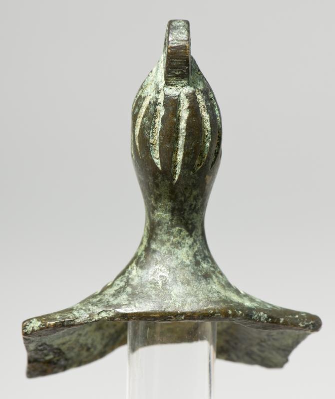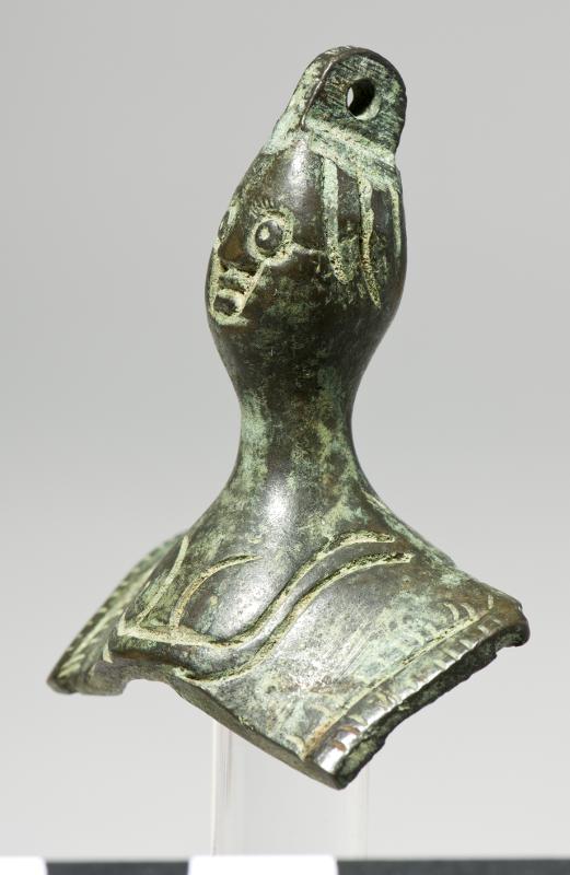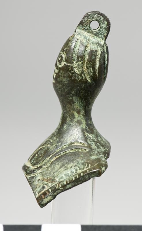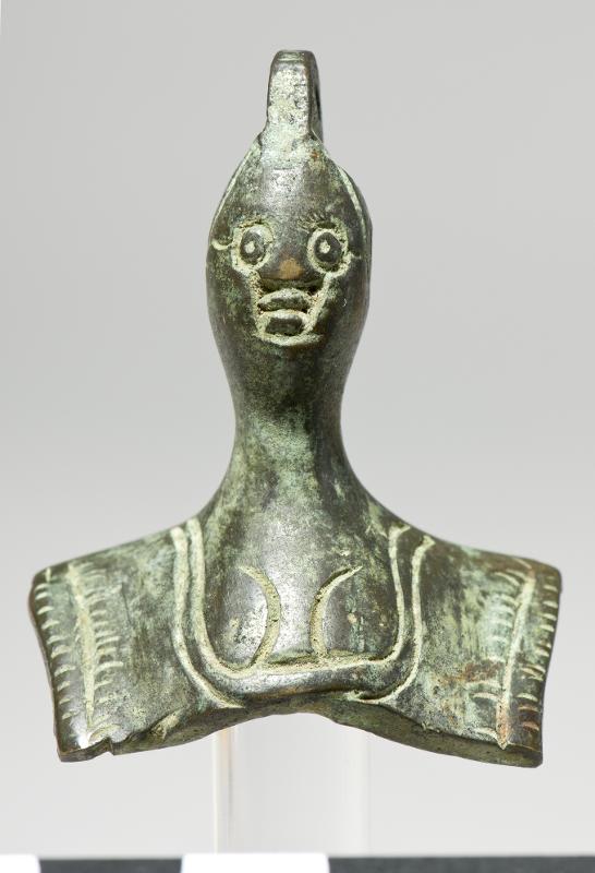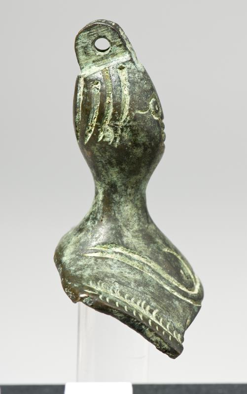Pendant in the shape of a female bust. Oval, massive head, long neck and hollow chest. Incised lines representing the clothes. Loop on top of the head.