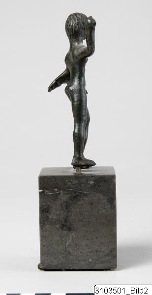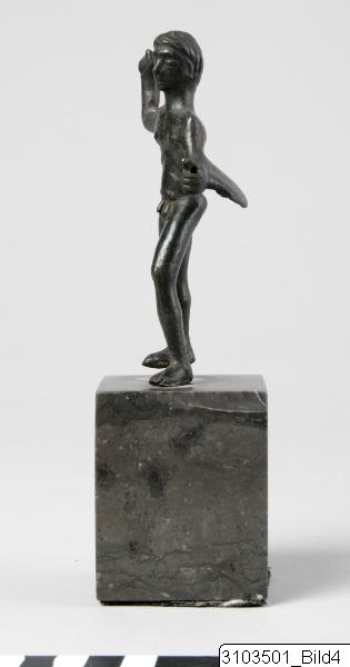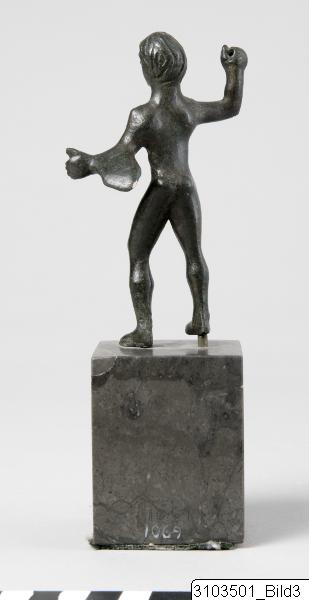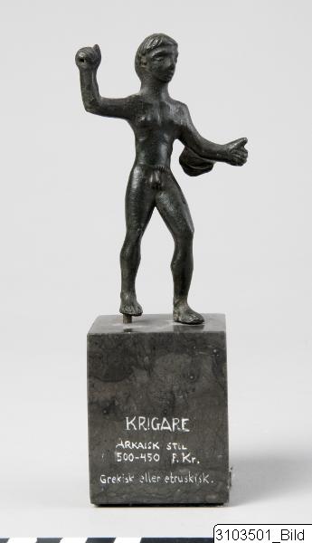 - Walking or running warrior. Naked except for a mantle hanging over the left arm. Right arm raised. Hole through both hands, the objects he has been holding are now missing.