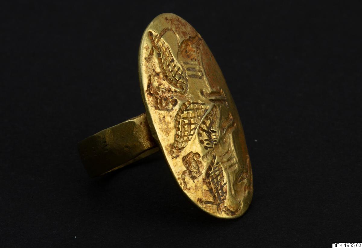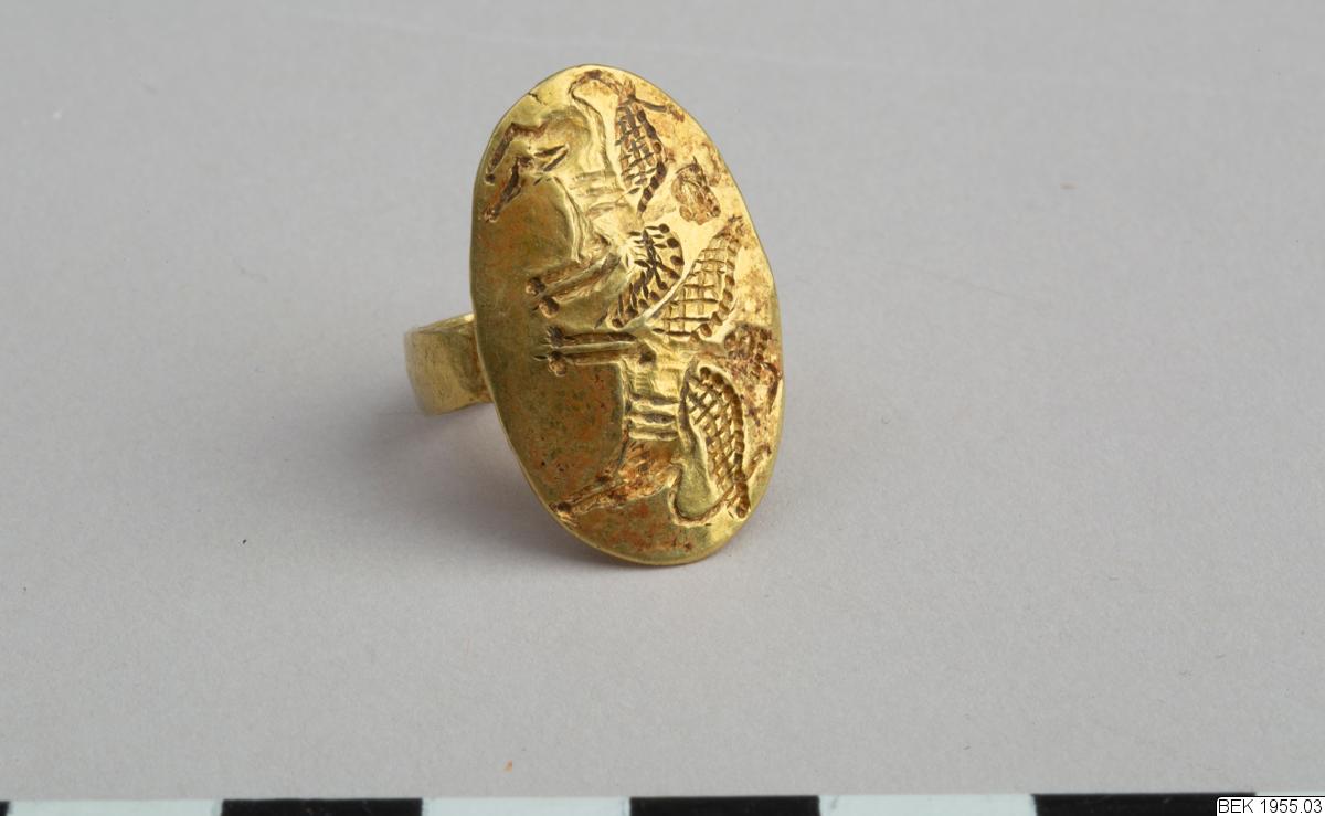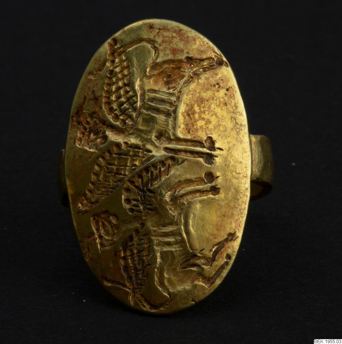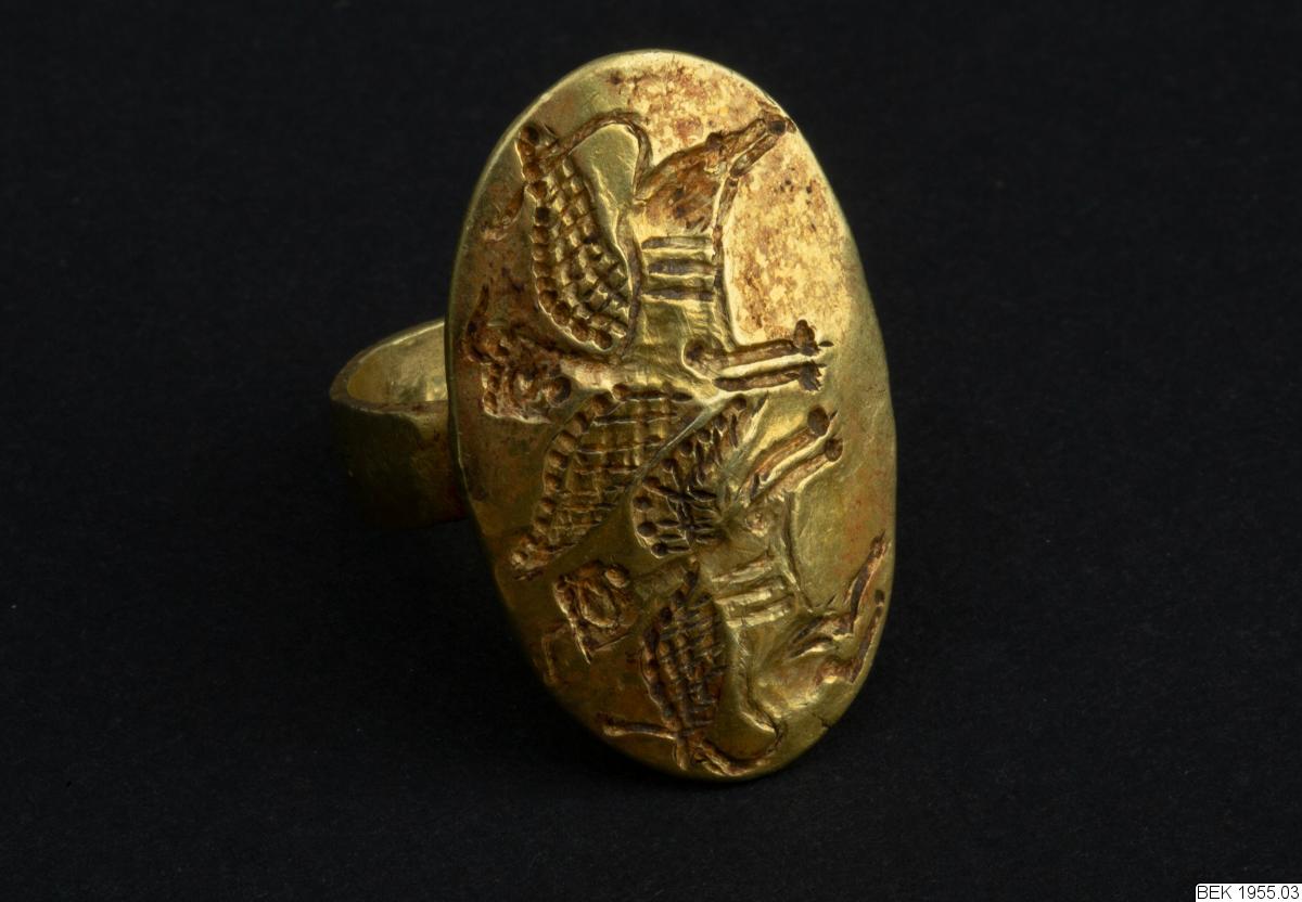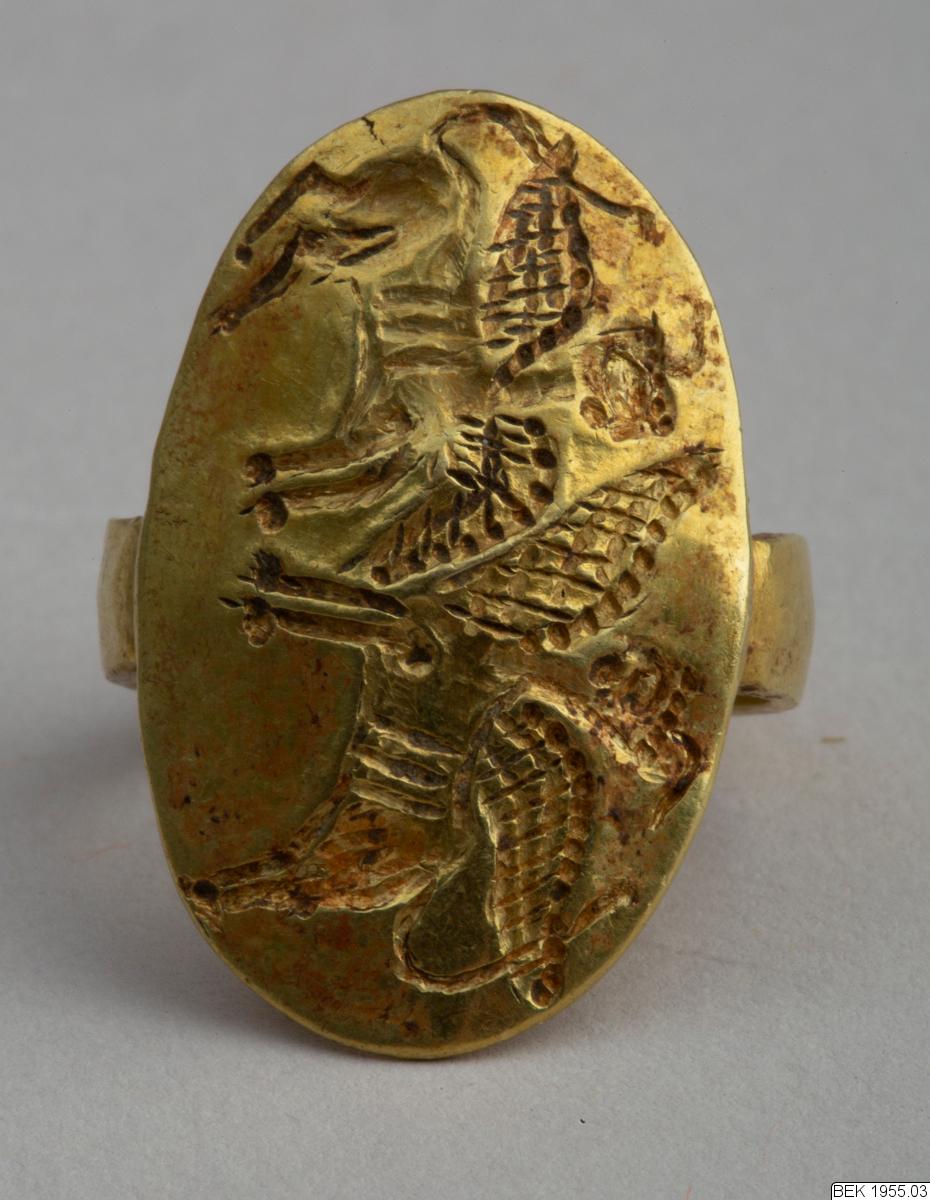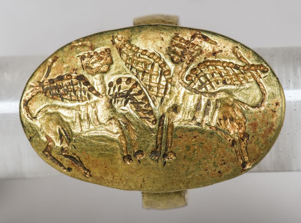 - Finger-ring, gold. Engraving depicts two griffins in profile; with spread wings facing each other. Both of them are wearing floral crowns. Probably Mycenean ca 1200-1100 BC.