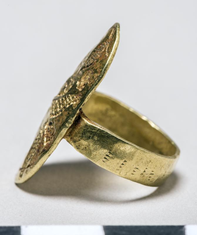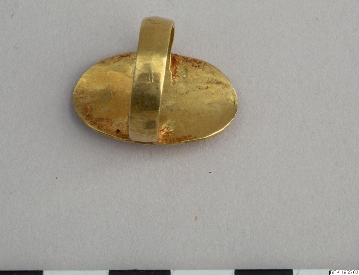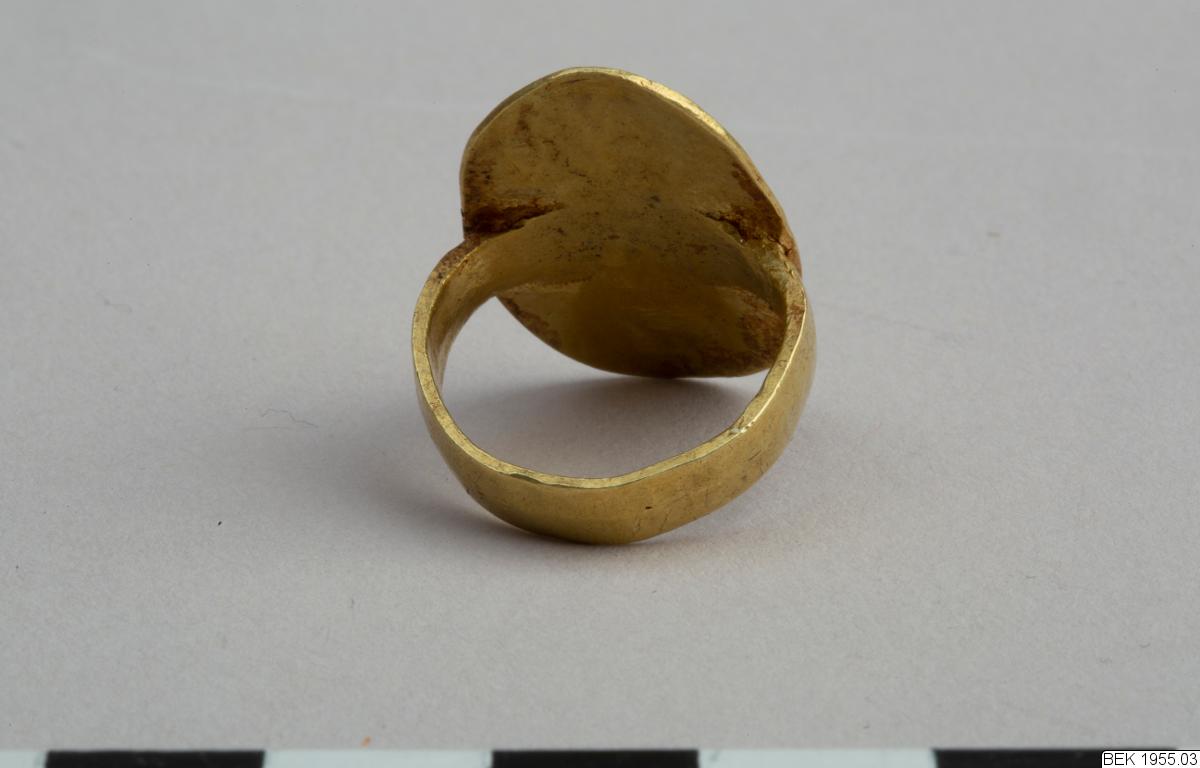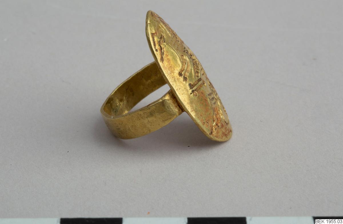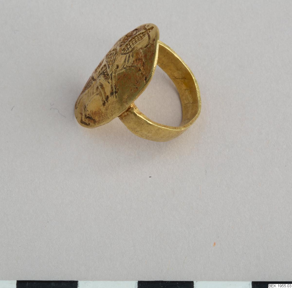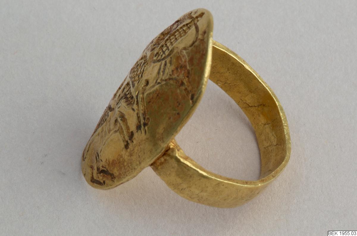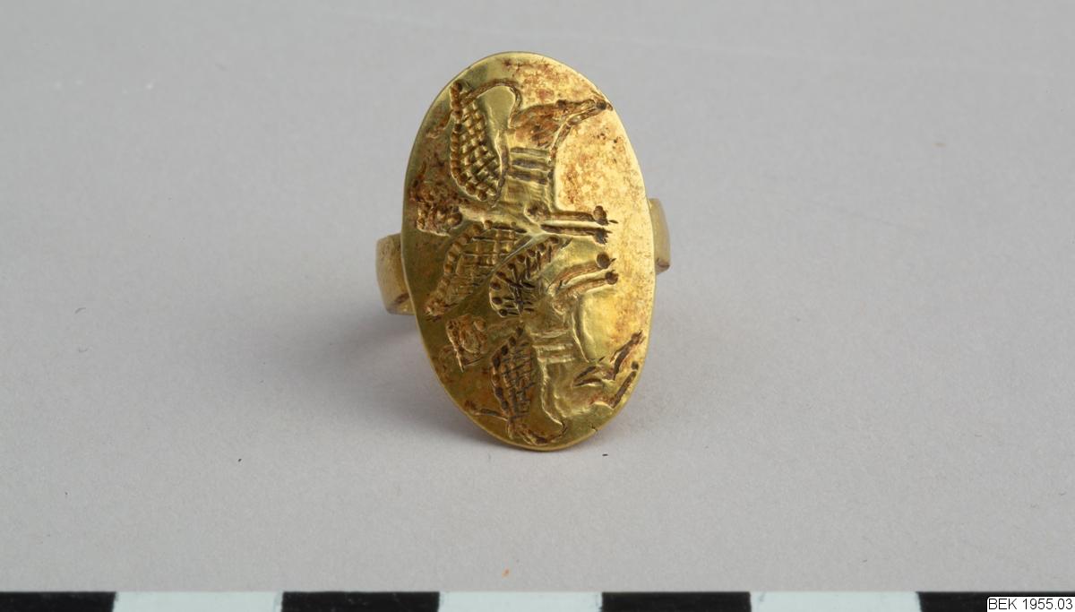 - Finger-ring, gold. Engraving depicts two griffins in profile; with spread wings facing each other. Both of them are wearing floral crowns. Probably Mycenean ca 1200-1100 BC.