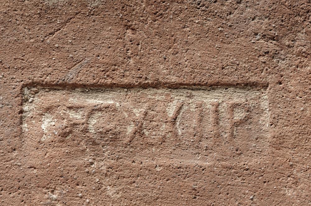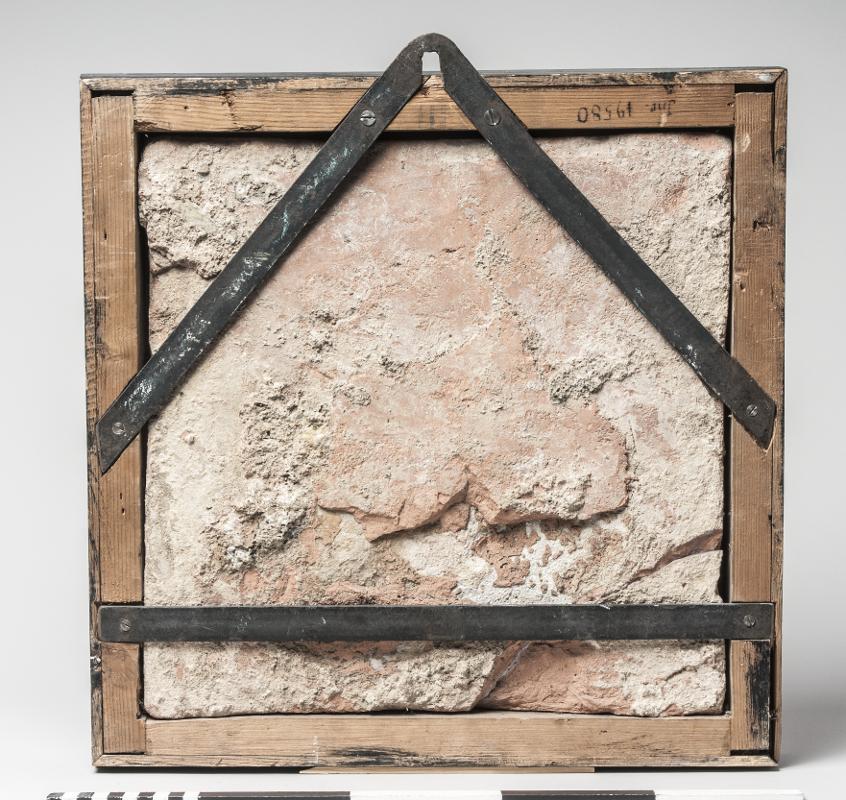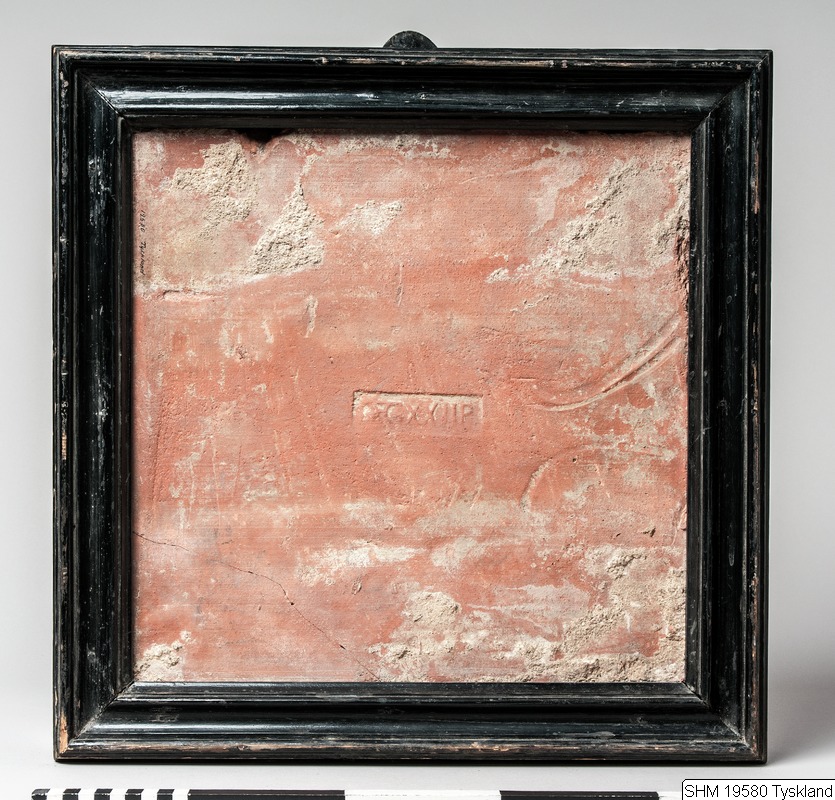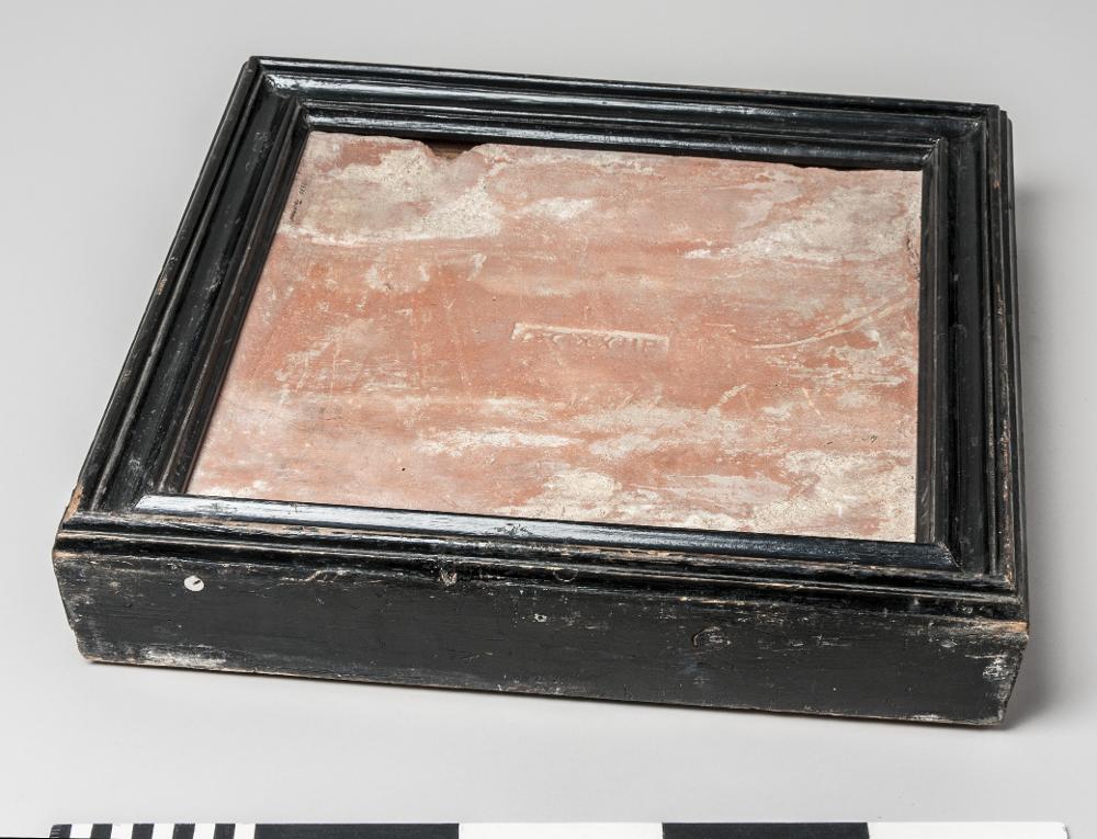 Square terracotta slab. Red paint on surface. Stamp legend in centre: