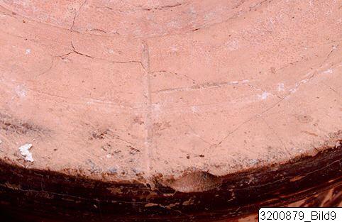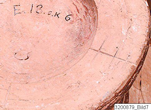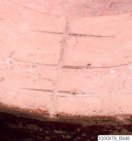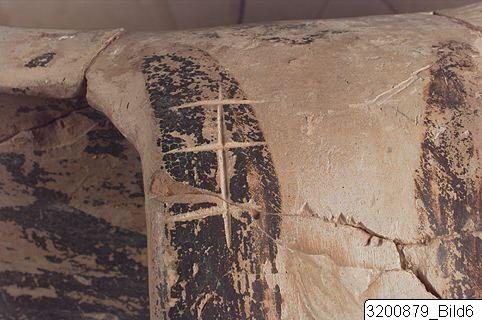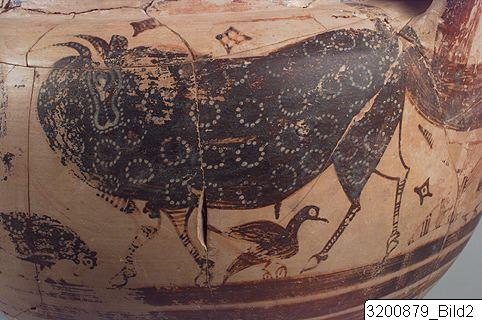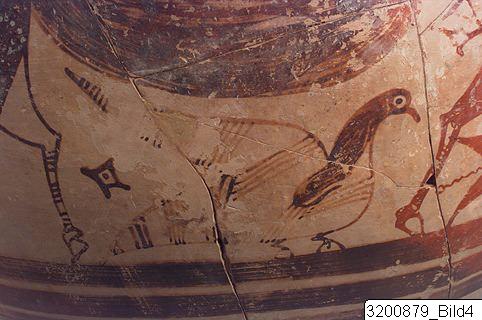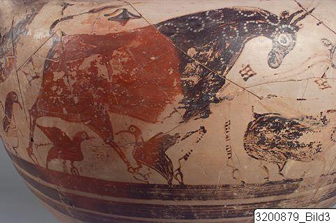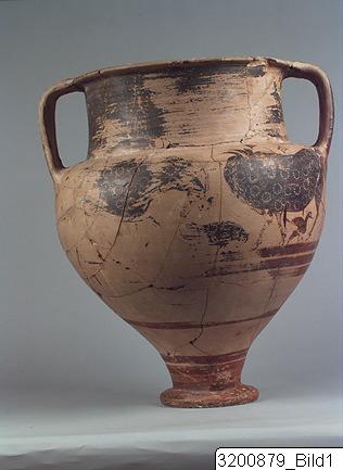- Amphoroid crater. Disc base; incised signs on base and handle consisting of three horizontal strokes crossed by vertical line and horizontal and vertical line on other handle; piriform body; wide, concave neck; sloping rim; wide, flat handles from rim to shoulder. Hard buff clay; lustrous buff slip; lustrous orange-red to black paint; matt light buff details. Base painted, bands encircling lower and mid body. Frieze encircling shoulder and upper body: on each side there are two big bulls facing each other with one small bull below; bulls surrounded by birds, hatched lozenges, lozenges filled with dots and filled lozenges. All bulls are covered with paint except from legs who are decorated with horizontal strokes or no decoration at all; dots or dotted rosettes on paint; long horns and four of them with raised tails; birds painted except the biggest who is decorated with lines.