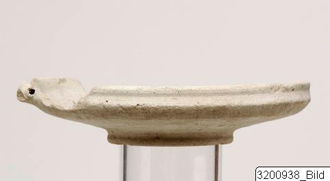 - Ring-base; roughly hemispherical body; carinated shoulder; everted rim; string-hole projection at the rim; hard, pinkish buff clay; light buff slip.