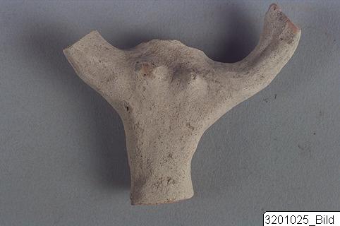 - Female figurine. Solid, cylindrical body; projecting breasts; raised arms; wide neck. Hard, brick clay; matt, light buff slip.