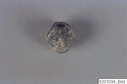 - Biconical spindle whirl; pierced hole in the longitudinal axis; greyish black stone.