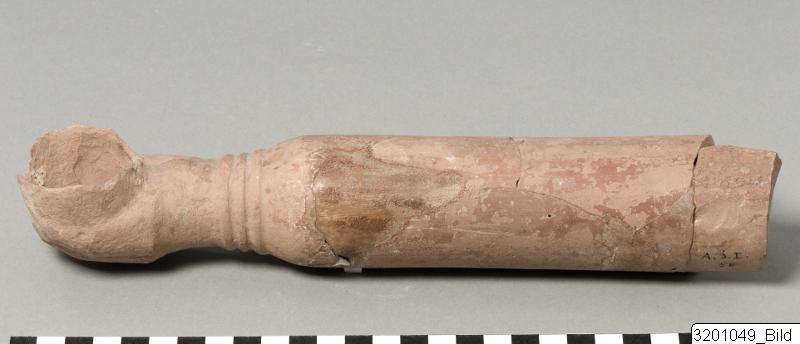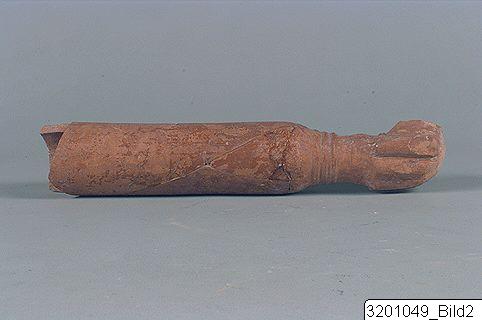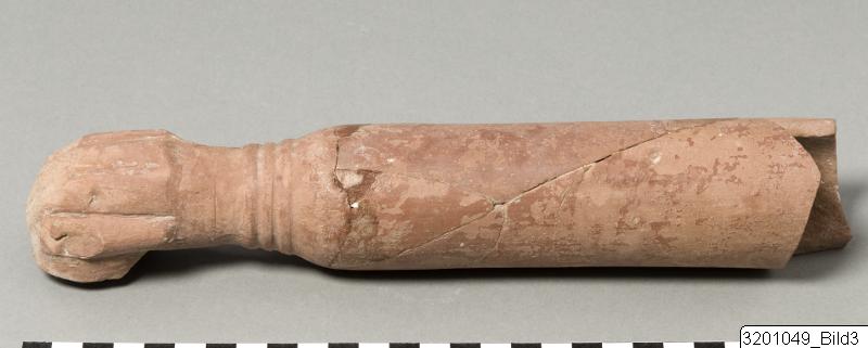 - Long, cylindrical arm-shaped vessel; one end shaped as a hand with fingers holding a cup; three ridges encircling hand-base. Hard reddish clay, red lustrous slip.