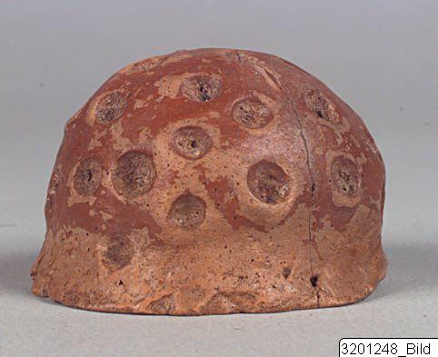 - Hemispherical, hollow with impressed dots. Soft, pinkish buff clay; lustrous, red slip.