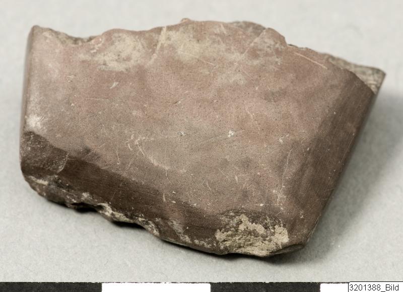 - Flat sides; almost straight cuttin edge. Dark reddish brown, polished basalt.