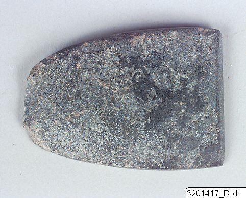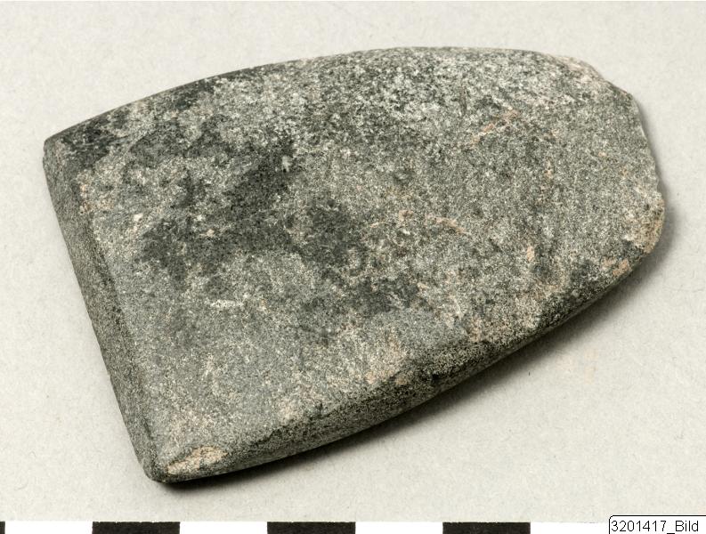 - Thin, flat; slightly rounded top; convex, rounded and flattened sides; straight cutting edge; polished. Basalt.