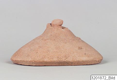 - Conical body; sloping rim. Hard, greyish brown clay; matt, pinkish buff slip.