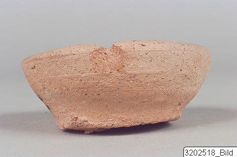 - Flat base; wide, rather deep body; plain rim. Hard, pinkish buff clay; matt light buff slip.