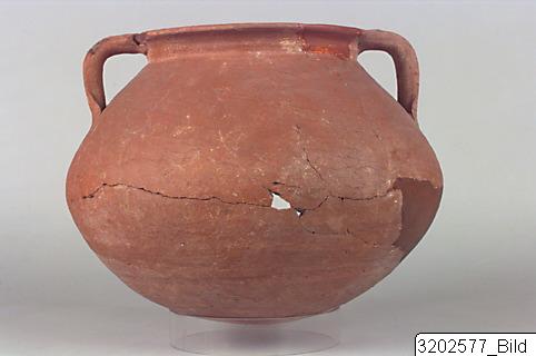 - Round base; biconical body; no neck; spreading rim; slightly bilobate handles from rim to shoulder. Hard, brick clay with grey core.