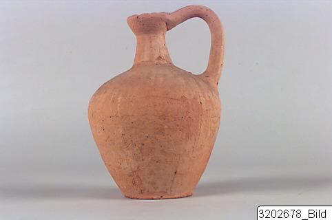 - Flat base; piriform body; small tapering neck; funnel mouth. Hard, pinkish buff clay; cream buff slip .
