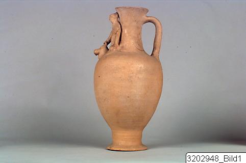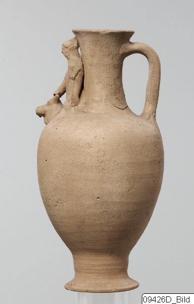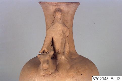 - Hollow, stemmed disc-base; ovoid body; tall, concave neck; horizontal rim; flat handle from upper neck to shoulder. Female figurine holding her right hand on a bull´s head on front shoulder; figurine is handmade, face made in a mould. Hard, cream-yellow clay; matt, light buff slip.