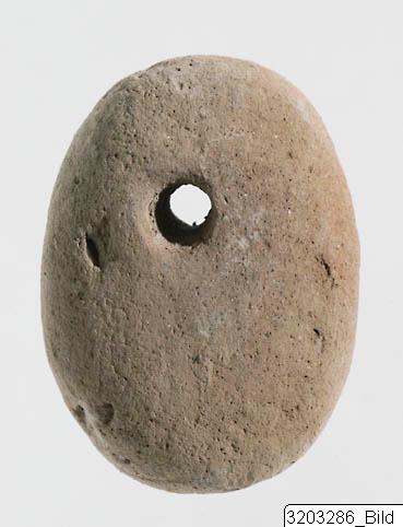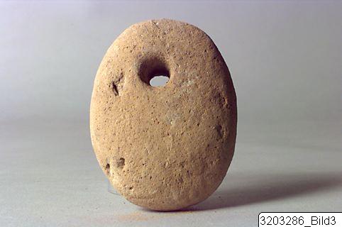 - Oval, convex in profile with pierced, concave hole. Semi-hard, pinkish buff clay.