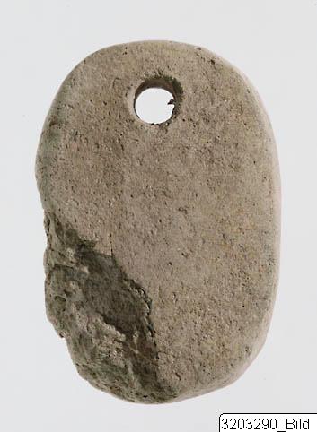 - Oval, almost flat with pierced hole. Semi-hard, light greyish clay.