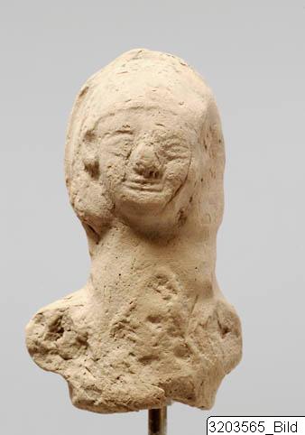- Moulded, female statuette; fragmentary projections instead of arms; large facial features; headdress; hair falling down on either side of head. Hard buff clay. Hollow.