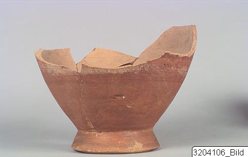 - Tall, wide ring-base; oval body. Hard, buff clay; matt, red buff slip. Matt, red to black and white paint; base painted; reddish and white bands encircling lower body.