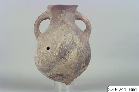 - Knobbed base; ovoid body; wide neck, widening upwards; plain rim; round handles from mid-neck to upper body. Hard, pinkish buff clay; matt, dark grey slip.