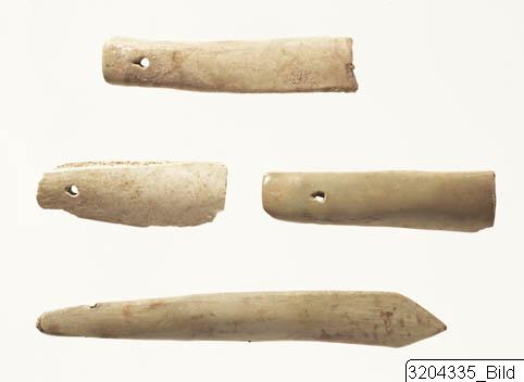 - Stylus; almond-shaped in profile with triangular edge; pierced widthwise at top. Light greenish yellow bone (goat's rib). Three tools; rectangular; pierced at end. Possibly for knitting fish-net.