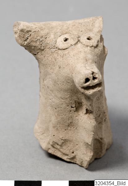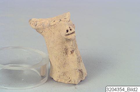 - Bull´s head. Modelled brisket; triangular-shaped, narrow head; pierced pellet eyes; curved horns; incisions for mouth and nose. Semi-soft, pinkish buff clay.