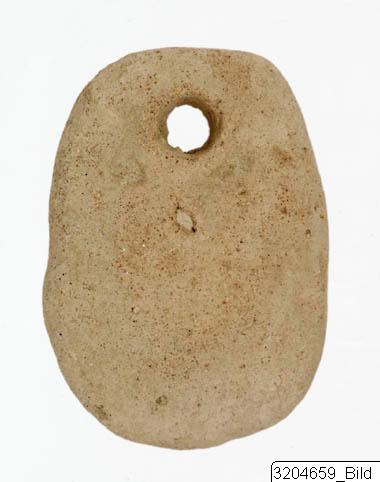 - Oval; pierced at one end. Semi-hard buff terracotta..