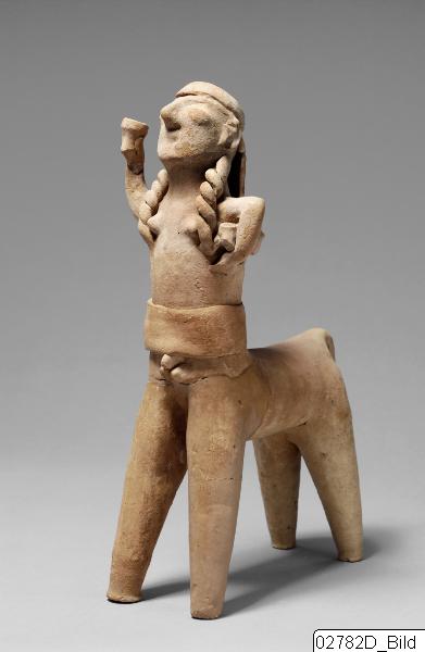 ; Function: Long wheel-made animal body with long tubular legs. It has a cylindrical torso with male genital organs, female breasts, and thin, short arms. It has a broad, ovoid head with locks of hair hanging down. The statuette served as a votive gift at the cult centre excavated at Ayia Irini, Cyprus.