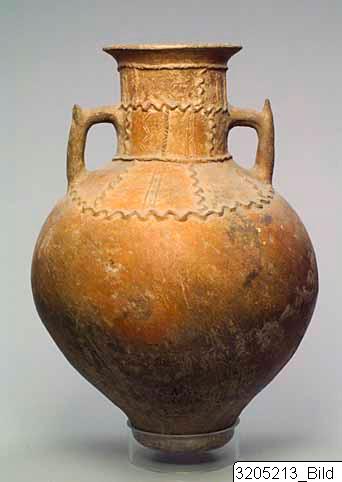 - Large amphora (store jar). Almost globular body with knob base. Cylindrical neck, flat mouth. Two vertical, pointed handles from neck to shoulder. Wavy relief lines, and vertical incised decorations, on neck and shoulder. Ridges encircling upper and lower neck.