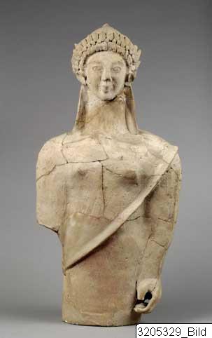 Female statuette with wheelmade flattened body. Breast marked as two faint projections. Vertical arms. Long neck. Mouldmade face with very archaic expression; smiling mouth; prominent, straight nose; oblique eyes in shape of myrtle-leaves. On both sides of neck, plaits hang down to the shoulder. Above the arched, conventionalized front-hair, there is a high diadem composed of buttons and leaves. The statue is also wearing a pointed cap. As regards the dress, only an oblique fold from left shoulder to right hip can be distinguished. Circular hole on back.