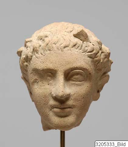 - Male head with moulded, somewhat triangular face; straight nose; eyes with incised irises and sculpted lids; curly hair rendered by incised lines; wearing wreath. The head is hollow.