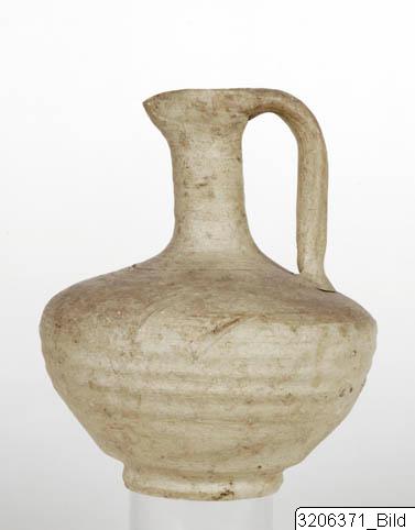 - Pinched mouth. Tall, narrow, concave neck. Biconical, wheel-made body. Handle from rim to shoulder. Ring-base. Incised line encircling neck-base. Hard, light buff clay. Matt, buff slip.