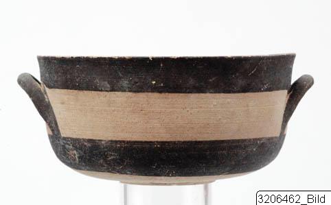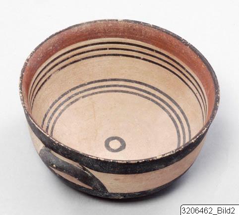 - Deep body. Plain rim. Slightly carinated profile. Somewhat flattened base. Two small, horizontal, round handles on mid-body. Black band encircling upper and lower part of body. Handles painted black. Red band encircling interior body just below rim. Two groups of three black lines encircling interior body. Small black circle on bottom. Matt buff slip. Matt black and brownish red paint. Buff clay. Buff slip on exterior. Buff-pinkish slip on interior. Matt black and red paint.