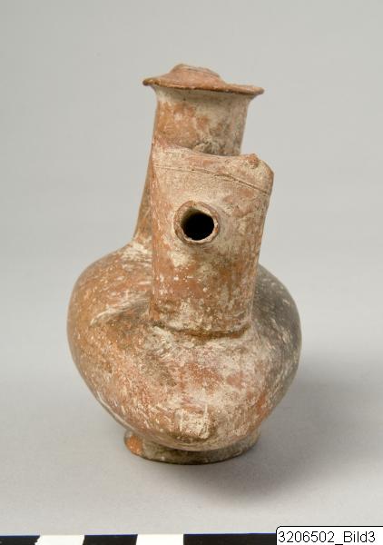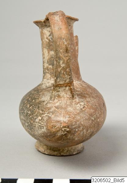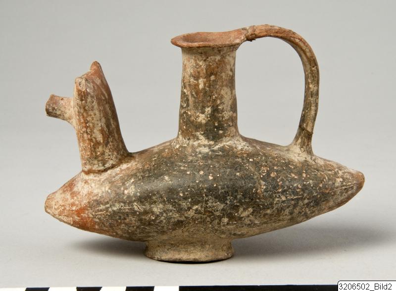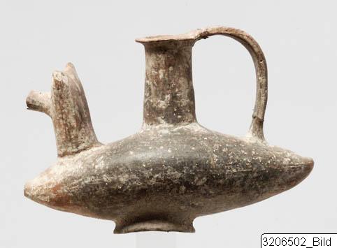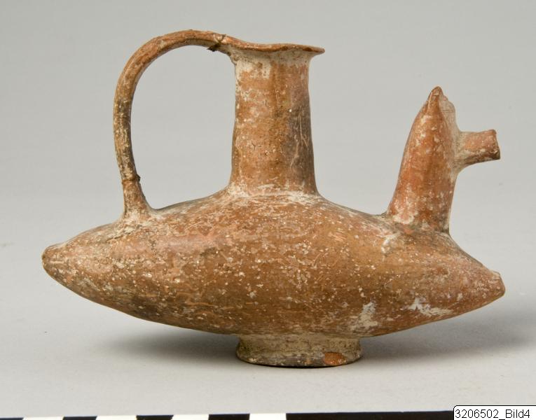 - Animal-shaped jug. Out-turned rim. Rather tall, narrow, tapering neck. Slightly raised handle from rim to shoulder. Flattened body. Spout opposite handle. Base-ring. Brownish-grey clay.