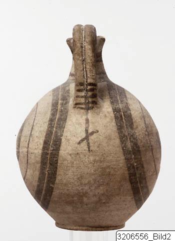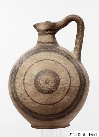 - Pinched mouth. Short concave neck. Globular body. Raised, twin handle from rim to shoulder. Slightly raised base. Decoration: brown and reddish-brown paint. Brown concentric circles on both sides of the body. Band encircling neck-base. Wavy, reddish-brown line on neck and two brown lines encircling rim. Rim painted brown. Horizontal, brown strokes on handle. From the handle a vertical line is prolonged downwards and crossed by an oblique line. Buff clay, buff slip.